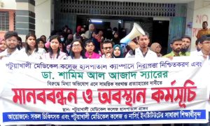 পটুয়াখালী: তিন দফা দাবি আদায়ে আজও অবস্থান এবং মানববন্ধন কর্মসূচি পালন করেছেন পটুয়াখালী মেডিকেল কলেজ হাসপাতালের ইন্টার্ন চিকিৎসক ও নার্সিং ইনস্টিটিউটের শিক্ষার্থীরা। শনিবার (১৯ এপ্রিল) সকাল ১১টার দিকে পটুয়াখালী মেডিকেল […]