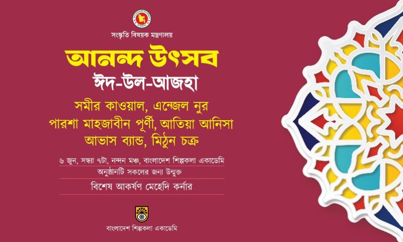 ঈদের আমেজে যখন গোটা দেশ আনন্দে মুখর, তখনই রাজধানীর সংস্কৃতি প্রেমীদের জন্য বিশেষ উপহার নিয়ে হাজির বাংলাদেশ শিল্পকলা একাডেমি। ঈদ উল আযহা উপলক্ষে একাডেমির নন্দনমঞ্চে আয়োজিত হতে যাচ্ছে বর্ণাঢ্য সাংস্কৃতিক অনুষ্ঠান ‘আনন্দ উৎসব’। সংস্কৃতি বিষয়ক মন্ত্রণালয়ের পৃষ্ঠপোষকতায় এবং বাংলাদেশ শিল্পকলা একাডেমির ব্যবস্থাপনায় ৬ জুন, শুক্রবার সন্ধ্যা সাড়ে ৬টায় শুরু হবে এই উৎসবের পর্দা উঠার আনুষ্ঠানিকতা।