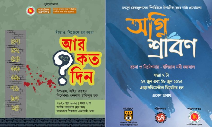 মনসুন রেভ্যুলেশনের স্পিরিটকে উপজীব্য করে সংস্কৃতি বিষয়ক মন্ত্রণালয়ের পৃষ্ঠপোষকতায় এবং বাংলাদেশ শিল্পকলা একাডেমির আয়োজনে শুক্রবার (২৭ জুন) উদ্বোধনী মঞ্চায়ন হবে নাটক ‘আর কত দিন’ এবং ‘অগ্নি শ্রাবণ’।