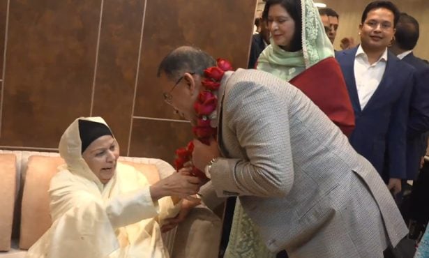 বিমানবন্দরে তারেক রহমানের গলায় মালা পড়িয়ে দেন তার শাশুড়ি সৈয়দা ইকবাল মান্দ বানু।