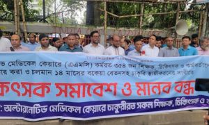 ঢাকা: রাজস্ব খাতে চাকরি স্থানান্তর এবং ১৫ মাসের বকেয়া বেতনের দাবিতে অল্টারনেটিভ মেডিকেল কেয়ার (এএমসি) প্রকল্পে নিয়োগ পাওয়া ৩৫৪ জন চিকিৎসক ও শিক্ষকদের মানববন্দন অনুষ্ঠিত হয়েছে। রোববার (৭ সেপ্টেম্বর) সকালে […]