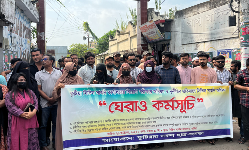 কুষ্টিয়া: নিয়োগ বাণিজ্য, প্রশ্নফাঁস ও ঘুষের অভিযোগে কুষ্টিয়া সিভিল সার্জন কার্যালয় ঘিরে বিক্ষোভ করেছেন ছাত্র-জনতা।রোববার (২৬ অক্টোবর) বেলা ১১টায় কার্যালয়ের প্রধান ফটকের সামনে সড়ক অবরোধ করে এই বিক্ষোভ অনুষ্ঠিত হয়।
