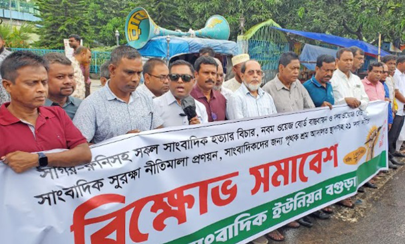 বগুড়া: সাগর-রুনিসহ সব সাংবাদিক হত্যার বিচার, নবম ওয়েজ বোর্ড বাস্তবায়ন ও দশম ওয়েজ বোর্ড গঠন, সাংবাদিক সুরক্ষা নীতিমালা প্রণয়ন, সাংবাদিকদের জন্য পৃথক শ্রম আদালত স্থাপনসহ বগুড়ায় ২১ দফা দাবিতে মানববন্ধন করা হয়েছে।