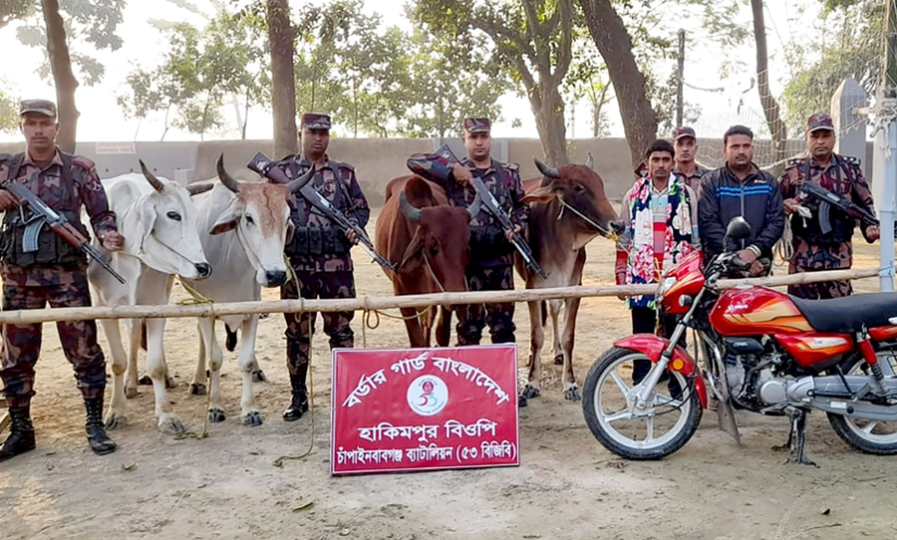 বিজিবির পাঠানো প্রেস বিজ্ঞপ্তিতে জানানো হয়, ভোররাত প্রায় ৪টার দিকে গোপন তথ্যের ভিত্তিতে শিবগঞ্জ উপজেলার রঘুনাথপুর গ্রামের তৈমুর রহমানের ছেলে রজদুল (৩০) এবং সদর উপজেলার চরবাগডাংগা বড়গোটাপাড়া গ্রামের আলাউদ্দিনের ছেলে শাকিলকে (৩২) ভারতীয় গরু চোরাচালানের সময় আটক করা হয়। এ সময় একটি মোটরসাইকেলও জব্দ করা হয়।