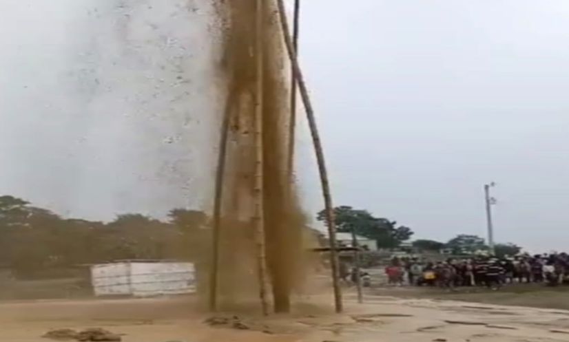 সুনামগঞ্জ: ধর্মপাশায় গভীর নলকূপ বসানোর সময় মাটির নিচ থেকে উচ্চ চাপে কাদাজল মিশ্রিত গ্যাস বের হচ্ছে।