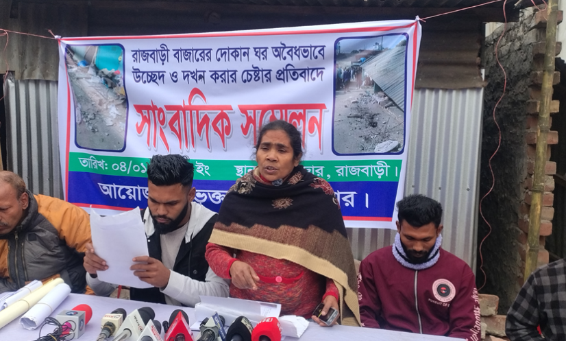 রাজবাড়ী: রাজবাড়ী জেলা শহরে বিনা নোটিশে সবজি ব্যবসায়ীকে দোকান থেকে উচ্ছেদের প্রতিবাদে সংবাদ সম্মেলনে করেছেন ভুক্তভোগী ব্যবসায়ী ও তার পরিবারের সদস্যরা।