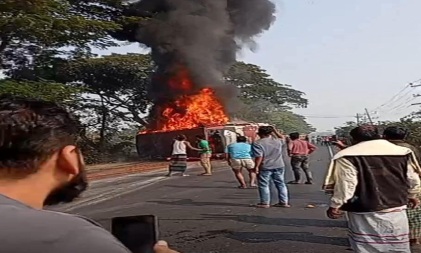 ওসি ইকবাল বাহার মজুমদার বলেন, মোটরসাইকেল এবং বাসের সংঘর্ষের পর মোটরসাইকেলের তেলের ট্যাংক থেকে আগুনের সূত্রপাত হতে পারে। এতে পুরো বাসে আগুন ধরে যায়। পরে ফায়ার সার্ভিস ও পুলিশ এসে আগুন নিভিয়ে পরিস্থিতি নিয়ন্ত্রণে আনে। ঘটনাস্থল থেকে শিশুসহ চার জনের মরদেহ উদ্ধার করা হয়েছে।