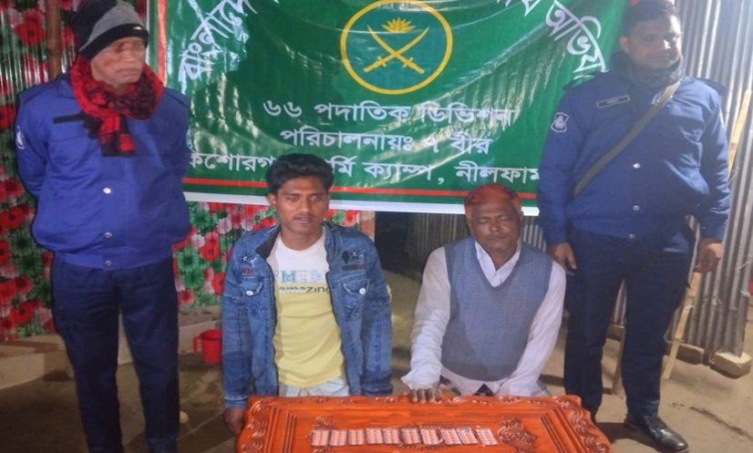 নীলফামারী: যৌথ বাহিনীর অভিযানে বিপুল পরিমাণ ট্যাপেন্টাডল ট্যাবলেটসহ মাদক কারবারি বাবা-ছেলে গ্রেফতার হয়েছে। রোববার (১৮ জানুয়ারি) দিবাগত রাতে নীলফামারীর কিশোরগঞ্জ উপজেলার নিতাই গাংবের এলাকা থেকে তাদের গ্রেফতার করা হয়।