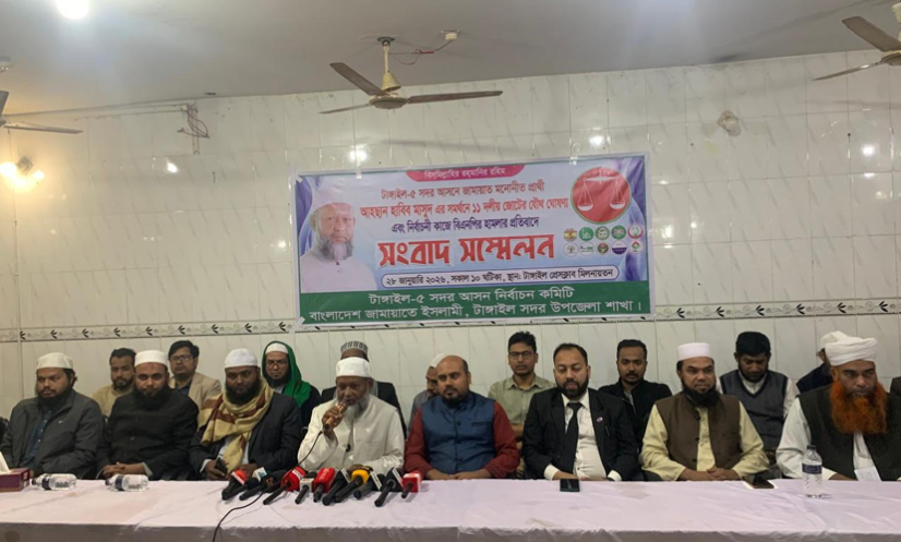 টাঙ্গাইল: টাঙ্গাইল সদর (৫) আসনে জামায়াত মনোনীত প্রার্থী আহসান হাবীব মাসুদের সমর্থনে ১১ দলীয় জোটের যৌথ ঘোষণা এবং নির্বাচনি কাজে বিএনপির হামলার প্রতিবাদে সংবাদ সম্মেলনের আয়োজন করা হয়েছে।