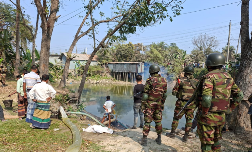 সেনাবাহিনী ও স্থানীয় প্রশাসনের উপস্থিতিতে পুকুরটিতে তল্লাশি চলছে। নিরাপত্তার স্বার্থে সাধারণ মানুষের চলাচল ওই এলাকায় সীমিত করা হয়েছে।