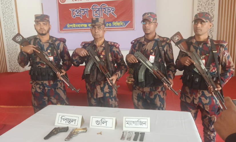 গত ৬ মাসে চাঁপাইনবাবগঞ্জের বিভিন্ন সীমান্তে ১৪টি আগ্নেয়াস্ত্র ও ৪৪ রাউন্ড গুলি ও সাড়ে ৯ কেজি বিস্ফোরক জব্দ করেছে বিজিবি।