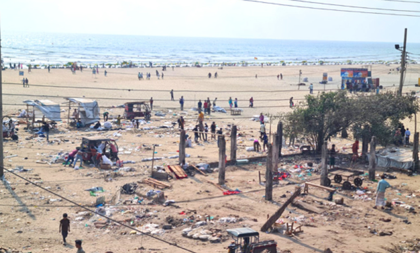 কক্সবাজারের সুগন্ধা পয়েন্টের সৈকত এলাকা থেকে নিজেদের দোকান ও স্থাপনা ভেঙে মালামাল সরিয়ে নিয়েছেন ব্যবসায়ীরা।