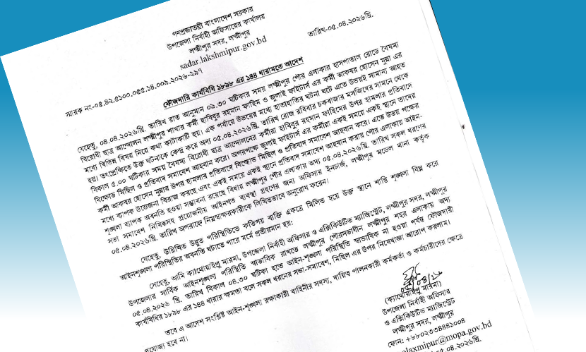লক্ষ্মীপুর সদর উপজেলা নির্বাহী অফিসার (ইউএনও) ও নির্বাহী ম্যাজিস্ট্রেট ক্যাথোয়াইপ্রু মারমা সই করা এক আদেশে এই তথ্য জানানো হয়।