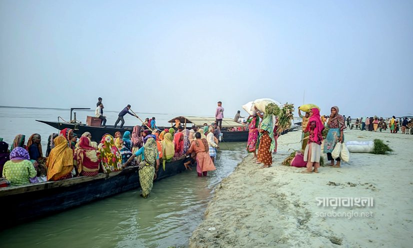 মঙ্গলবার (১৪ এপ্রিল) বৈশাখের প্রথম বিকেল। গাইবান্ধার ফুলছড়ি উপজেলায় ব্রহ্মপুত্র নদে ইঞ্জিনচালিত নৌকা ভেসে চলছে ধীর গতিতে। সেই নৌকাগুলোর একটিতে গাদাগাদি করে বসে আছেন অর্ধশতাধিক নারী। তাদের সবার কাঁধেই ঘাস বা খড়ের বস্তা । চোখে মুখে ক্লান্তির ছাপ । দিনভর কাজ শেষে তারা ফিরছেন নিজের ঘরে । চরের সেই অস্থায়ী ঠিকানায়, যেখানে জীবনের নিরাপত্তা প্রতিদিনই প্রশ্নের মুখে।