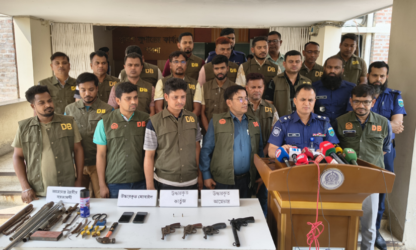 সংবাদ সম্মেলনে কথা বলছে পুলিশ; পাশেই রাখা উদ্ধার করা অস্ত্র।