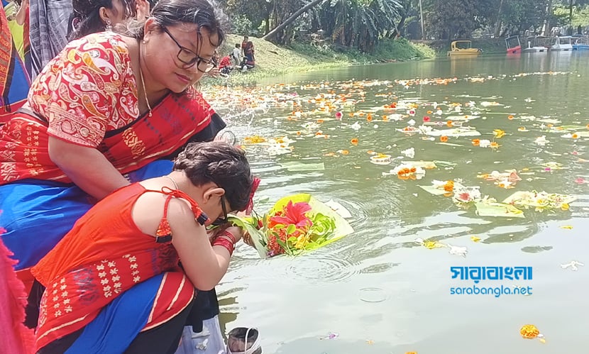 ‎নারীদের সারিবদ্ধভাবে দাঁড়িয়ে জলে ফুল ভাসানোর দৃশ্যটি ছিল মনে রাখার মতো। তাদের হাত জোড় করা প্রার্থনা আর বিনম্র ভঙ্গি যেন প্রকৃতির সাথে মানুষের এক আত্মিক সম্পর্কের জানান দিচ্ছিল।