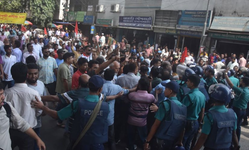চট্টগ্রাম ব্যুরো: মিছিল-সমাবেশের ওপর পুলিশের নিষেধাজ্ঞা উপক্ষো করে চট্টগ্রাম বন্দর ভবন অভিমুখে বিক্ষোভ মিছিল বের করেছিল শ্রমিক-কর্মচারী ঐক্য পরিষদ (স্কপ)। তবে পুলিশের বাধায় তারা বন্দর ভবন পর্যন্ত যেতে পারেনি। পুলিশের সঙ্গে বাগ্বিতণ্ডা পর সংগঠনটি আগামী ১ নভেম্বর ‘শ্রমিক অনশনের’ ডাক দিয়ে সর্বস্তরের জনতাকে এ আন্দোলনে শরিক হবার আহ্বান জানায়।