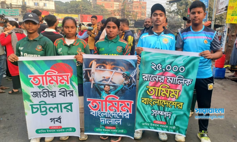 রোববার (১১ জানুয়ারি) বিকেলে তামিমের বাড়ির অদূরে নগরীর কাজির দেউড়ির মোড়ে প্ল্যাকার্ড হাতে মানববন্ধনে দাঁড়ান ভক্তরা।