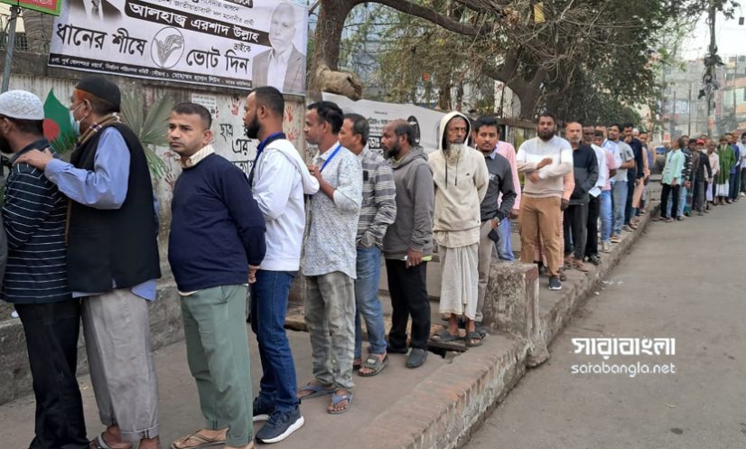 ভোট কেন্দ্রের বাইরে লাইনে দাঁড়িয়ে আছেন ভোটাররা। ছবি: সারাবাংলা