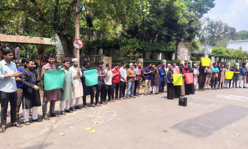 মঙ্গলবার (৩১ মার্চ) দুপুরে বিশ্ববিদ্যালয়ের প্রশাসনিক ভবনের সামনে এ মানববন্ধন করেন তারা। এ সময় ২৪ ঘণ্টার মধ্যে হামলাকারীদের গ্রেফতার এবং ক্যাম্পাসকে বহিরাগতমুক্ত করার দাবি জানানো হয়।