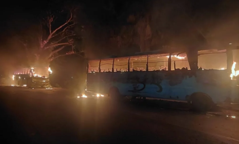 সংঘর্ষের পর উত্তেজিত জনতা বাসে আগুন দেয়।