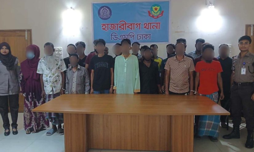 গ্রেফতাররা হলো- জিহাদ শেখ (২৩), অনিক আহম্মেদ শাওন (৩০), মো. চাঁন মিয়া (১৯), মো. রবিন (২৩), মো. আশরাফুল ইসলাম রনি (২৮), মো. সুজন (৪৮), মো. আরিফ (২৬), মো. কাদের (৩৬), মো. রুবেল (২৮), মো. সাজিদুল (২০), মো. রিয়াদ হোসেন (২০), মো. সুমন (৩০), সানজিদা হাসান (১৯), মো. ইমরান (৩১), আতাউল হাসান (২৮), তন্ময় খাতুন মিতু (২৫), ফজলে রাব্বি (২৬), হাবিবুল্লাহ (৩৫), মো. মাজেদুল ইসলাম (৫০), মো. রাশেদুল ইসলাম (২৮), মো. সালাউদ্দিন (৫৮), মোহাম্মদ মনির হোসেন (৫০) ও মো. শাহজাহান (৪৫)।