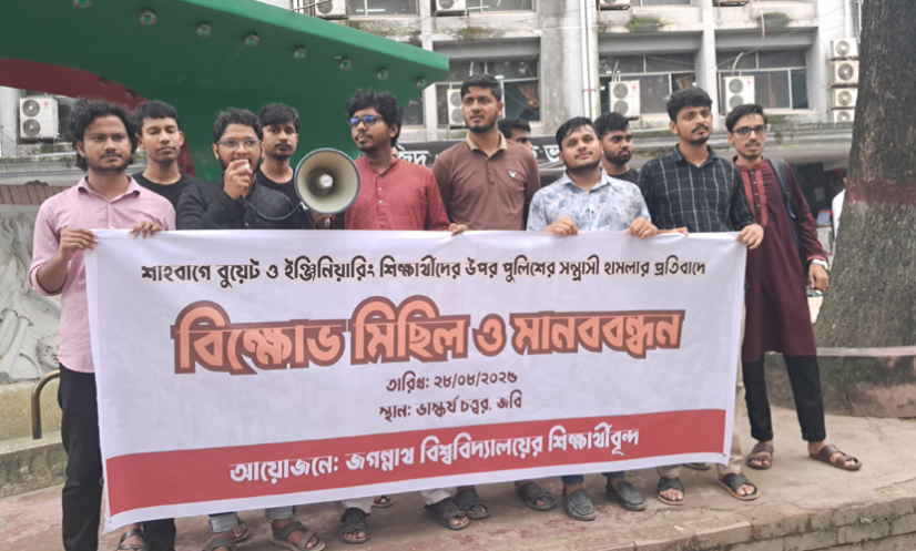 জগন্নাথ বিশ্ববিদ্যালয়: শাহবাগে প্রকৌশল বিশ্ববিদ্যালয় (বুয়েট) শিক্ষার্থীদের ওপর পুলিশের হামলার প্রতিবাদে বিক্ষোভ মিছিল ও মানববন্ধন কর্মসূচি পালন করেছে জগন্নাথ বিশ্ববিদ্যালয়ের (জবি) শিক্ষার্থীরা।