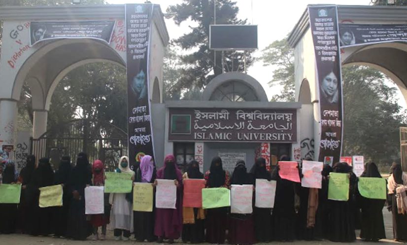ইবি: বিএনপি নেতা মোশারফ হোসেন ঠাকুরের মুসলিম নারীর হিজাব ও নিকাবকে কুরুচিপূর্ণ মন্তব্যের প্রতিবাদে মানববন্ধন করেছে ইসলামী বিশ্ববিদ্যালয়ের (ইবি) নারী শিক্ষার্থীরা।