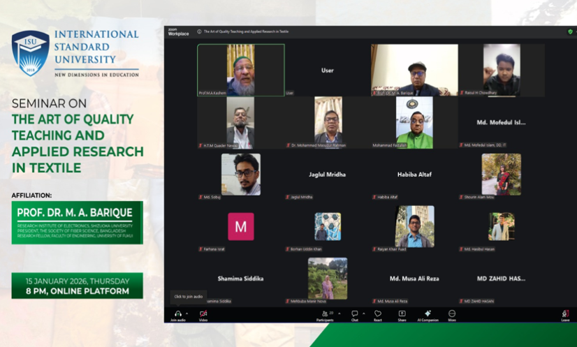 ঢাকা: ইন্টারন্যাশনাল স্ট্যান্ডার্ড ইউনিভার্সিটির (আইএসইউ) মহাখালী ক্যাম্পাসে অনলাইনে অনুষ্ঠিত হয়েছে ‘দি আর্ট অব কোয়ালিটি টিচিং অ্যান্ড অ্যাপ্লাইড রিসার্চ ইন টেক্সটাইল’ শীর্ষক সেমিনার।