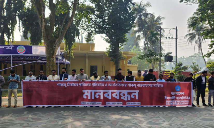 রাবি: শাহজালাল বিজ্ঞান ও প্রযুক্তি বিশ্ববিদ্যালয় কেন্দ্রীয় ছাত্র সংসদ (শাকসু) নির্বাচন স্থগিতের প্রতিবাদ ও শাকসু বাস্তবায়নের দাবিতে মানববন্ধন করেছে রাজশাহী বিশ্ববিদ্যালয়ে (রাবি) শাখা ছাত্রশিবির।
