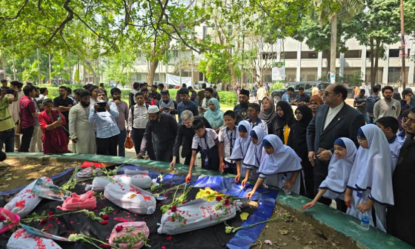 সকাল থেকেই বটতলা এলাকায় শিক্ষক, শিক্ষার্থী ও সাধারণ মানুষ জড়ো হয়ে সংহতি প্রকাশ করেন। সারিবদ্ধভাবে সাজানো ছোট ছোট প্রতীকী কফিন উপস্থিতদের মধ্যে শোকের আবহ তৈরি করে। সমাবেশে উপস্থিত কয়েকজন অভিভাবকও ক্ষোভ প্রকাশ করে দ্রুত যুদ্ধ বন্ধের দাবি জানান।