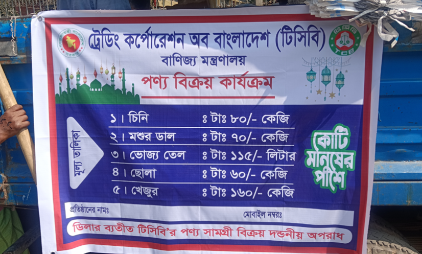 এর আগে, সোমবার এক সংবাদ বিজ্ঞপ্তিতে টিসিবি জানায়, রোজার মাসে ভোক্তাদের স্বস্তি দিতে নিয়মিত পণ্য সয়াবিন তেল, মসুর ডাল ও চিনির পাশাপাশি এবার ছোলা ও খেজুরও বিক্রি করা হবে। ট্রাকে পণ্য বিক্রির পাশাপাশি স্মার্ট পরিবার কার্ডধারীদের জন্য নির্ধারিত ডিলারের মাধ্যমেও টিসিবির পণ্য সরবরাহ অব্যাহত থাকবে।