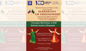 ঢাকা: ঢাকার রাশিয়ান হাউজের উদ্যোগে শুক্রবার (৫ ডিসেম্বর) রাজধানীর রবীন্দ্র সরোবরে কনসার্ট অনুষ্ঠিত হবে। ‘বন্ধুত্বের সম্প্রীতি: রাশিয়ান পাবলিক ডিপ্লোম্যাসির ১০০তম বার্ষিকী ও বাংলাদেশের বিজয় দিবস উদযাপন’- শীর্ষক এই উৎসবমুখর সাংস্কৃতিক […]