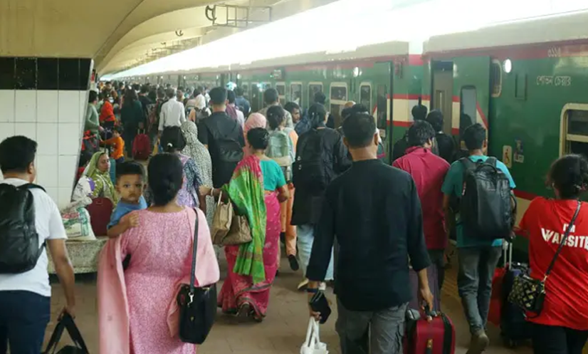সরেজমিনে দেখা গেছে, বৃহস্পতিবার ভোর থেকেই কমলাপুর রেলওয়ে স্টেশন এলাকাজুড়ে যাত্রীদের উপচে পড়া ভিড় বাড়ছে। প্রতিটি প্ল্যাটফর্মে ছিল মানুষের ঢল, যেন তিল ধারণের ঠাঁই নেই। এরই মধ্যে নিরাপদ ভেবে মানুষ ট্রেনকেই বেছে নিয়েছেন।