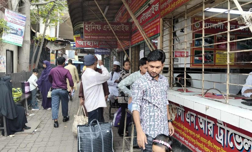 বাস কাউন্টারে দেখা যায়, ঈদের দিনেও অনেক কাউন্টার খোলা রয়েছে। কিছু যাত্রী এসে ভিড় জমাচ্ছেন। যাত্রীরা টিকিট কেটে বাসের অপেক্ষায় দাঁড়িয়ে আছেন। পরিবহন শ্রমিকরা হাঁকডাক ছেড়ে গন্তব্যের যাত্রী খুঁজছেন। মূলত পেশাজীবী মানুষের ছুটি না হওয়ায় তারাই বেশিরভাগ একা এবং পরিবার নিয়ে আজ বাড়ি ফিরছেন। কেউ ছুটছেন শ্বশুরবাড়ি, কেউ আবার ছুটছেন আত্মীয়স্বজনদের বাড়ি।