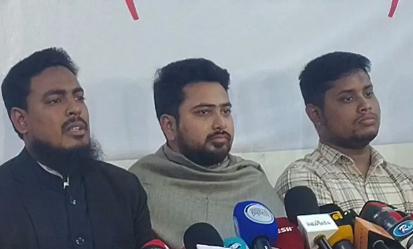 সংবাদ সম্মেলনে এনসিপির আহ্বায়ক নাহিদ ইসলামসহ দলটির শীর্ষ নেতারা।
