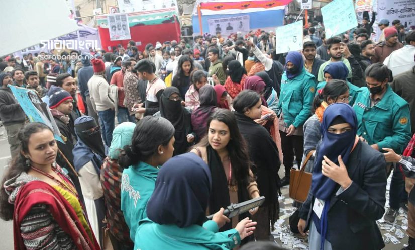 মঙ্গলবার (৬ জানুয়ারি) সকালে জগন্নাথ বিশ্ববিদ্যালয়ের ক্যাম্পাসে সরেজমিনে দেখা যায়, ভোটকেন্দ্রের সামনে দীর্ঘ লাইন। ভোট দিয়ে এসে অনেকেই একে অপরকে জড়িয়ে ধরছে, কেউ কেউ অমোচনীয় কালি লাগানো আঙুলের ছবি তুলছে, আবার কেউ গ্রুপ ছবি তুলে স্মরণীয় মুহূর্ত ধরে রাখছে।