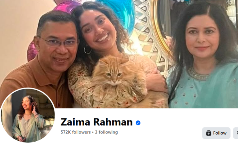 ঢাকা: বিএনপির চেয়ারম্যান তারেক রহমানের মেয়ে ব্যারিস্টার জাইমা রহমানের ফেসবুক ও ইনস্টাগ্রাম আইডি মেটা কর্তৃক (ফেসবুক ও ইনস্টাগ্রামের মাদার কোম্পানি) সম্প্রতি ভেরিফাই করা হয়েছে।