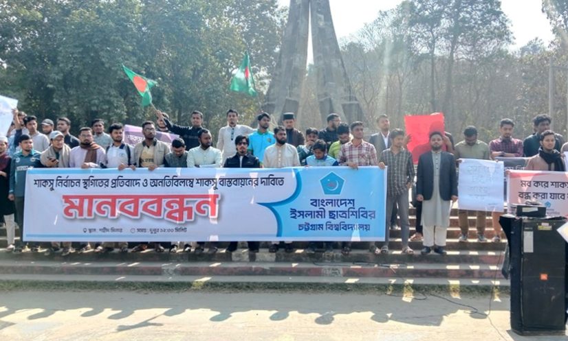 চট্টগ্রাম ব্যুরো: শাহজালাল বিজ্ঞান ও প্রযুক্তি বিশ্ববিদ্যালয় কেন্দ্রীয় ছাত্রসংসদ (শাকসু) নির্বাচন স্থগিতের প্রতিবাদ ও অবিলম্বে নির্বাচনের দাবিতে বিক্ষোভ করেছে চট্টগ্রাম বিশ্ববিদ্যালয় শাখা ইসলামী ছাত্রশিবির।