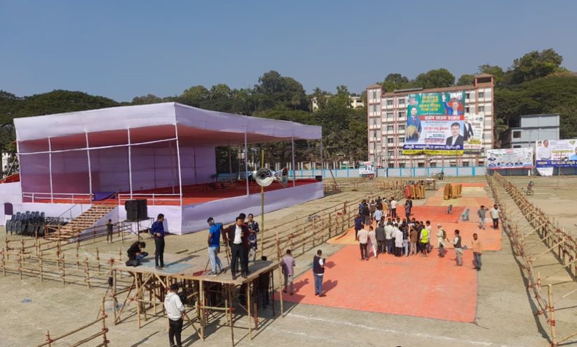 সমাবেশস্থলে গিয়ে দেখা গেছে, পলোগ্রাউন্ড মাঠে সমাবেশের জন্য তৈরি করা হয়েছে সাত ফুট উচ্চতার মঞ্চ। এর দৈর্ঘ্য ১০০ ফুট ও প্রস্থ ৬০ ফুট। সংশ্লিষ্টরা জানিয়েছেন, অন্তত ৩০০ লোকের বসার উপযোগী করে মঞ্চ তৈরি করা হয়েছে। এ ছাড়া, সমাবেশস্থল আশপাশের আরও ৪-৫ কিলোমিটার এলাকাজুড়ে দুই শতাধিক মাইক লাগানো হচ্ছে। তবে মঞ্চের আশপাশে মাইক লাগানোর কাজ শেষ হয়েছে। মাঠের বাইরে থাকা লোকজন যাতে তারেক রহমানের বক্তব্য সরাসরি দেখতে পান, সেজন্য স্থাপন করা হচ্ছে ১০টি এলইডি স্ক্রিন।
