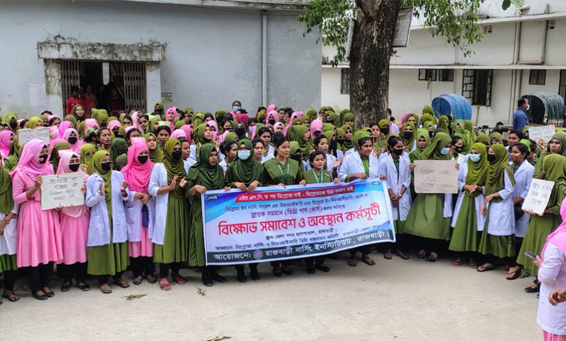 রাজবাড়ী: ডিপ্লোমা ইন নার্সিং সাইন্স অ্যান্ড মিডওয়াইফারি এবং ডিপ্লোমা ইন মিডওয়াইফারি কোর্সকে স্নাতক সমমান (ডিগ্রি পাস কোর্স) করার দাবিতে রাজবাড়ী সদর হাসপাতাল ক্যাম্পাসে বিক্ষোভ সমাবেশ ও অবস্থান কর্মসূচি পালন করেছে শিক্ষার্থীরা।
