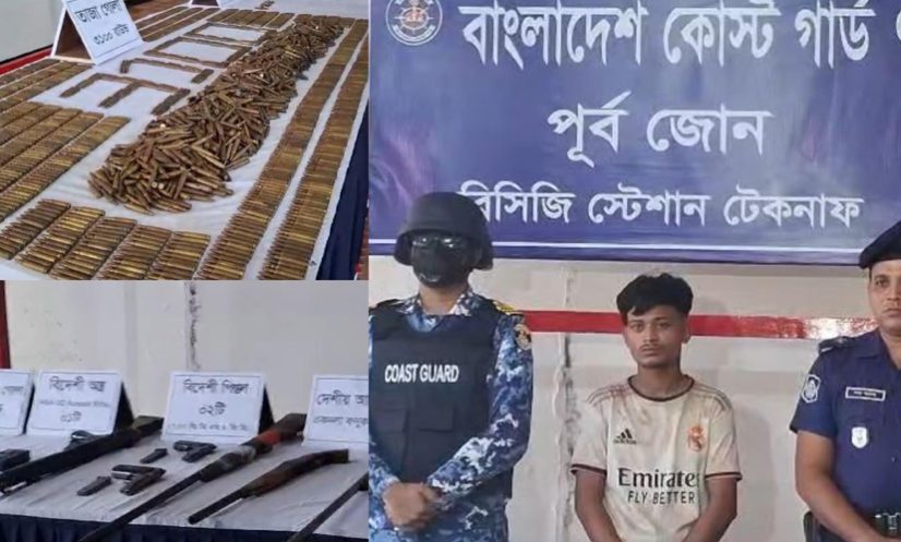 লে. কমান্ডার সালাহউদ্দিন রশীদ তানভীর বলেন, শনিবার (৫ জুলাই) মধ্যরাতে টেকনাফ উপজেলার হ্নীলা ইউনিয়নের জাদিমুরা সংলগ্ন পাহাড়ি এলাকায় একদল দূর্বৃত্ত বিপুল পরিমান অস্ত্রসহ অবস্থানের খবর পায় আইন-শৃঙ্খলা বাহিনী। পরে কোস্টগার্ড ও পুলিশের একটি যৌথদল সেখানে অভিযান চালায়। এতে ঘটনাস্থলে পৌঁছালে দূর্বৃত্তরা উপস্থিতি টের পেয়ে আইন শৃংখলা বাহিনীর সদস্যদের লক্ষ্য করে অর্তকিত এলোপাতাড়ী গুলিবর্ষণ ছুড়তে থাকে। আত্মরক্ষার্থে আইন শৃংখলা বাহিনীর সদস্যরাও পালটা গুলি ছুড়ে। গোলাগুলির এক পর্যায়ে দূর্বৃত্তরা রাতের অন্ধকারে গহীন পাহাড়ের দিকে পালিয়ে যায়।