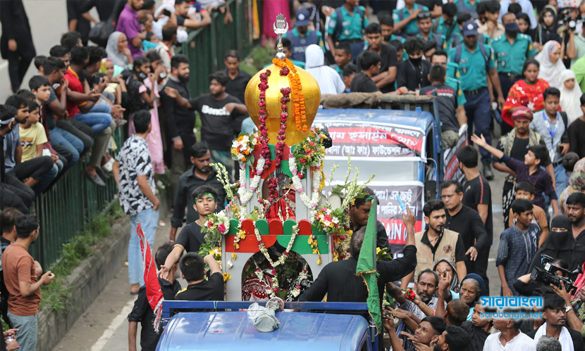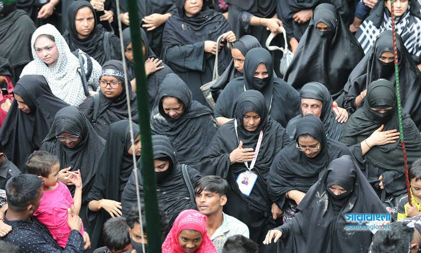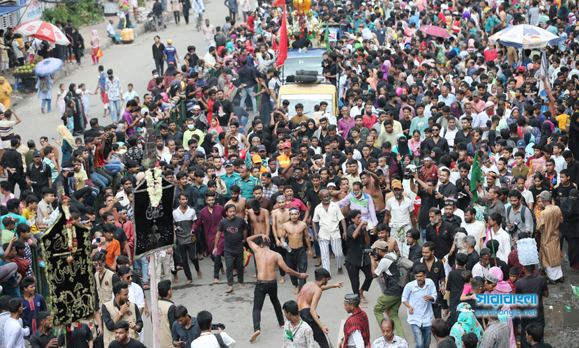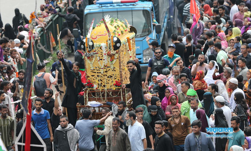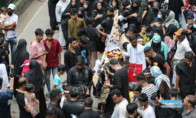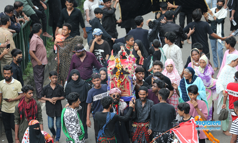 তাজিয়া মিছিলে কারবালার শোকাবহ ঘটনা স্মরণ করে কালো মখমলের চাঁদোয়ার নিচে কয়েকজন ইমাম হোসেন (রা.)-এর প্রতীকী কফিন বহন করেন। মিছিলের সামনে ছিল ইমাম হাসান ও ইমাম হোসেনের দুটি প্রতীকী ঘোড়াও। এই মিছিলের মাধ্যমে শিয়া সম্প্রদায় মহানবী (সা.)-এর নাতি ইমাম হোসেন (রা.)-এর আত্মত্যাগ ও শাহাদাতকে স্মরণ করে। শোকমিছিল ঘুরে ছবিগুলো ফ্রেমবন্দি করেছেন সারাবাংলার সিনিয়র ফটোকরেসপন্ডেন্ট হাবিবুর রহমান।