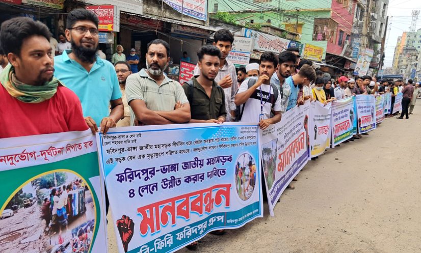 ফরিদপুর: ফরিদপুর থেকে ভাঙ্গা পর্যন্ত বেহাল মহাসড়কটি দ্রুত চার লেনে উন্নীত করার দাবিতে ফরিদপুরে মানববন্ধন কর্মসূচি পালন করেছে ছাত্র-জনতা। খানাখন্দে ভরা ৩০ কিলোমিটার মহাসড়ক দ্রুত সময়ের মধ্যে চলাচলের উপযোগী করা না হলে অবরোধসহ কঠোর আন্দোলনের হুশিয়ারি দিয়েছেন তারা।