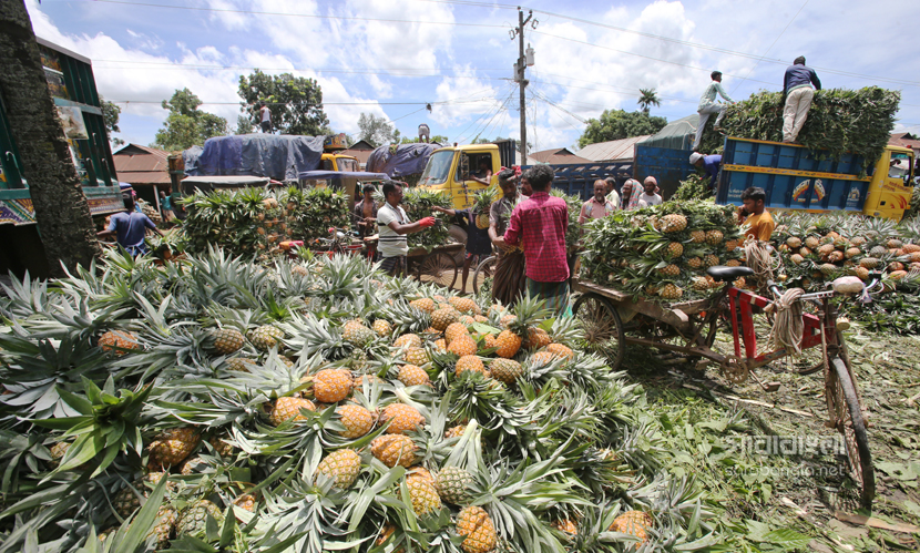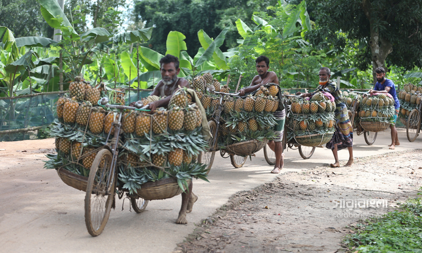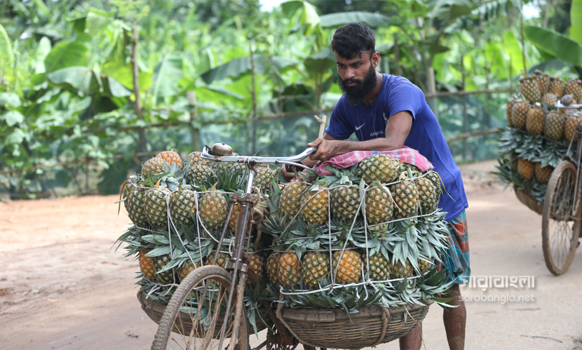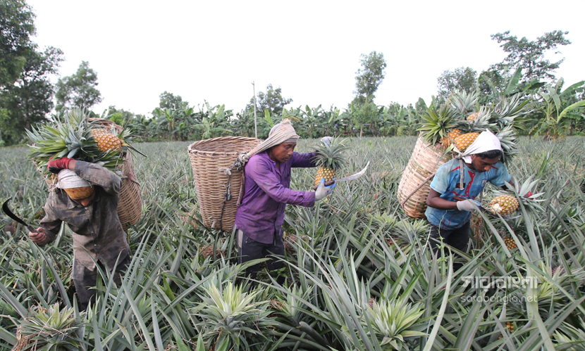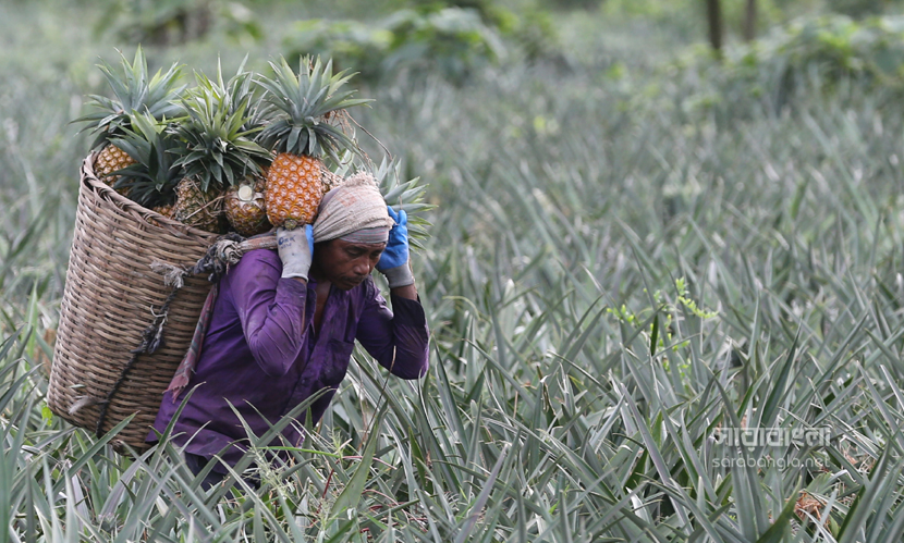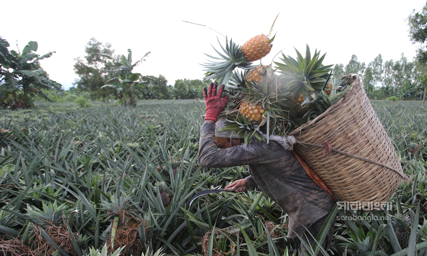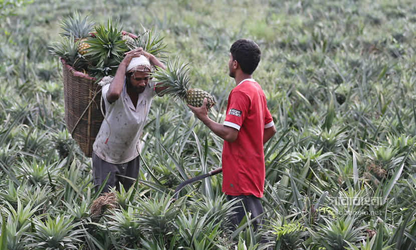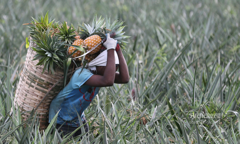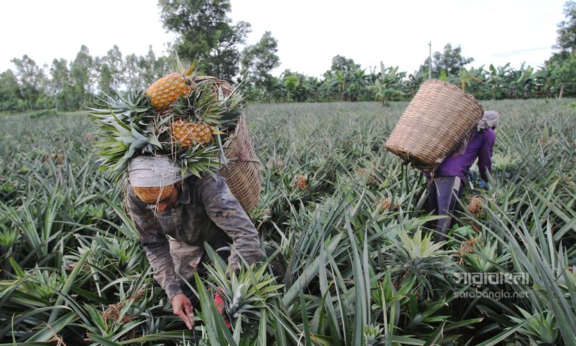 পর্তুগিজ ‘অ্যানান্যাস’ থেকে ‘আনারস’ শব্দের উৎপত্তি। বৈজ্ঞানিক নাম ‘অ্যানান্যাস সেটাইভ্যাস’। ক্যারিবীয় দ্বীপপুঞ্জের ফল এটি। ১৯৫০ সালের দিকে টাঙ্গাইলের মধুপুর উপজেলায় আনারসের বাণিজ্যিক চাষাবাদ শুরু হয়। ‘উত্তর থিকা আইল ফল-রসে টস টস, নাম আনারস’— আনারসের রাজধানী মধুপুর গড়ের মানুষের মুখে মুখে ছড়াটি যেন ঘুরে-ফিরে বেড়ায়। বর্তমানে মধুপুর ছাড়াও গড় এলাকার মুক্তাগাছা, ফুলবাড়িয়া, ঘাটাইল ও সখীপুর উপজেলার কয়েক হাজার হেক্টর জমিতে আনারস চাষ হচ্ছে। এই আনারস চাষকে কেন্দ্র করে সচল থাকছে এখানকার অর্থনীতি। মধুপুরের আনারস দেশের সীমানা পেরিয়ে ইউরোপের বিভিন্ন দেশে রফতানি হচ্ছে। জেলার ঐতিহ্যবাহী সুস্বাদু রসালো আনারস জিওগ্রাফিক্যাল আইডেন্টিফিকেশন (জিআই) বা ভৌগোলিক নির্দেশক পণ্যের স্বীকৃতিও পেয়েছে। সম্প্রতি মধুপুর গিয়ে খেত থেকে আনারস তোলাসহ বিভিন্ন পর্যায় ফ্রেমবন্দি করেছেন সারাবাংলার সিনিয়র ফটোকরেসপন্ডেন্ট হাবিবুর রহমান।