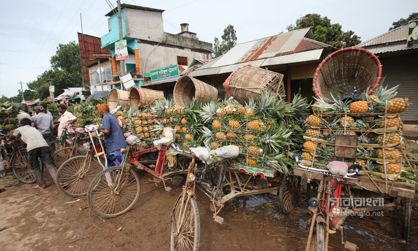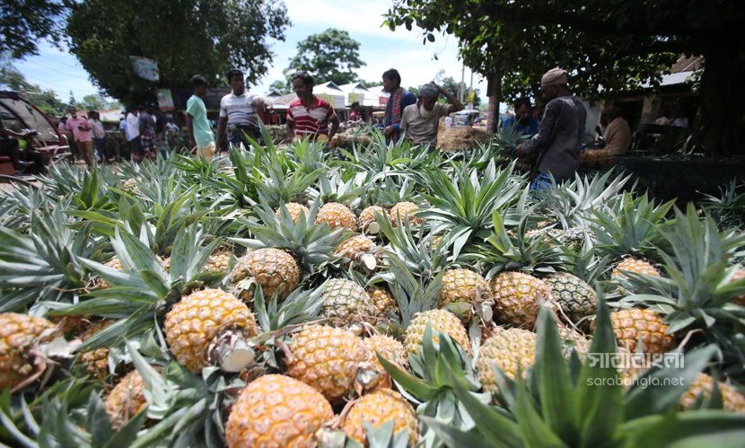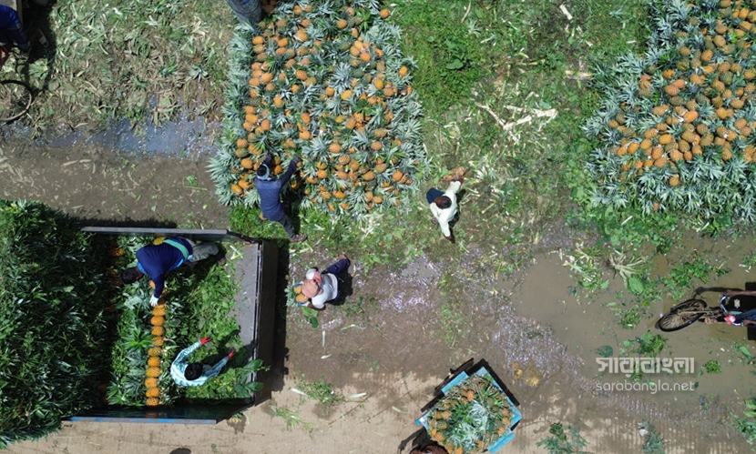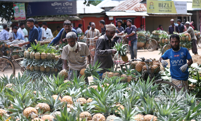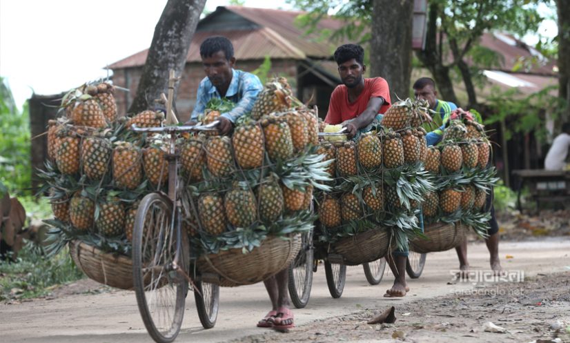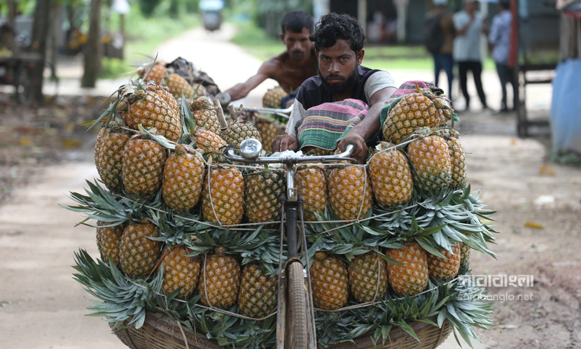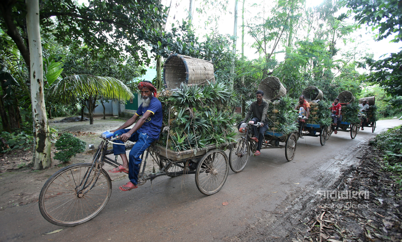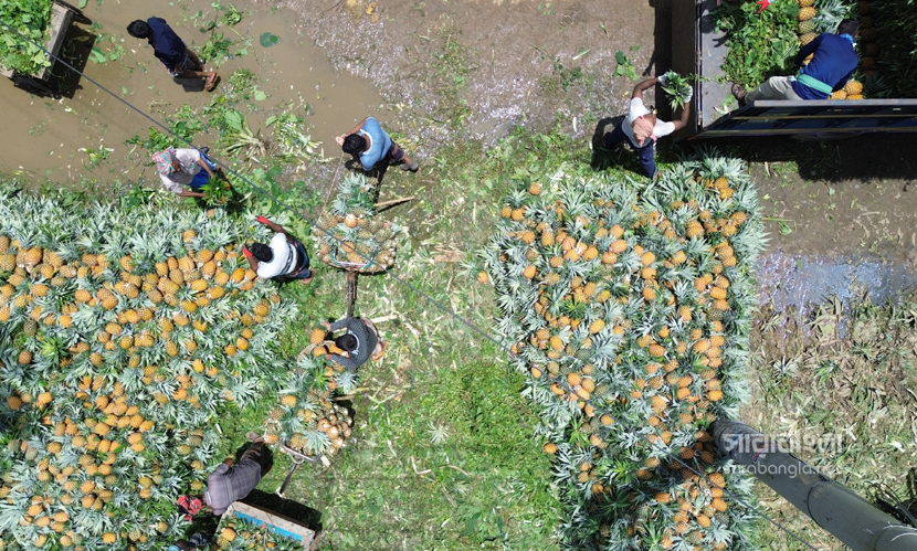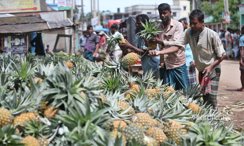 পর্তুগিজ ‘অ্যানান্যাস’ থেকে ‘আনারস’ শব্দের উৎপত্তি। বৈজ্ঞানিক নাম ‘অ্যানান্যাস সেটাইভ্যাস’। ক্যারিবীয় দ্বীপপুঞ্জের ফল এটি। ১৯৫০ সালের দিকে টাঙ্গাইলের মধুপুর উপজেলায় আনারসের বাণিজ্যিক চাষাবাদ শুরু হয়। ‘উত্তর থিকা আইল ফল-রসে টস টস, নাম আনারস’— আনারসের রাজধানী মধুপুর গড়ের মানুষের মুখে মুখে ছড়াটি যেন ঘুরে-ফিরে বেড়ায়। বর্তমানে মধুপুর ছাড়াও গড় এলাকার মুক্তাগাছা, ফুলবাড়িয়া, ঘাটাইল ও সখীপুর উপজেলার কয়েক হাজার হেক্টর জমিতে আনারস চাষ হচ্ছে। এই আনারস চাষকে কেন্দ্র করে সচল থাকছে এখানকার অর্থনীতি। মধুপুরের আনারস দেশের সীমানা পেরিয়ে ইউরোপের বিভিন্ন দেশে রফতানি হচ্ছে। জেলার ঐতিহ্যবাহী সুস্বাদু রসালো আনারস জিওগ্রাফিক্যাল আইডেন্টিফিকেশন (জিআই) বা ভৌগোলিক নির্দেশক পণ্যের স্বীকৃতিও পেয়েছে। সম্প্রতি মধুপুর গিয়ে খেত থেকে আনারস তোলাসহ বিভিন্ন পর্যায় ফ্রেমবন্দি করেছেন সারাবাংলার সিনিয়র ফটোকরেসপন্ডেন্ট হাবিবুর রহমান।