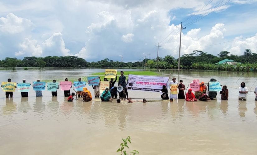 পটুয়াখালী: টেকসই বেড়িবাঁধ নির্মাণের দাবিতে কলাগাছের ভেলায় ভেসে সংবাদ সম্মেলন করেছেন পটুয়াখালীর কলাপাড়ার বানভাসী মানুষ।