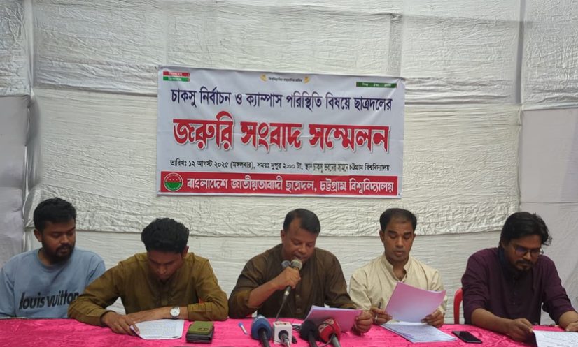 মঙ্গলবার (১২ আগস্ট) দুপুরে ক্যাম্পাসে চাকসু ভবনের সামনে ‘চাকসু নির্বাচন ও ক্যাম্পাস পরিস্থিতি’ বিষয়ে এক জরুরি সংবাদ সম্মেলনে এ দাবি জানান ছাত্রদল নেতারা।