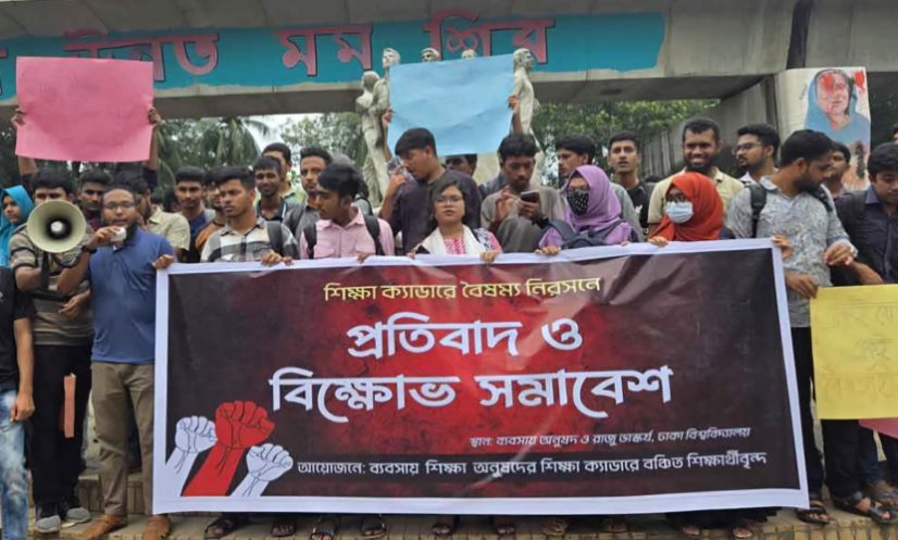 ঢাকা: বাংলাদেশ পাবলিক সার্ভিস কমিশনের (বিপিএসসি) শিক্ষা ক্যাডারে আনুপাতিক হারে ক্যাডার সংখ্যা বন্টনের দাবিতে বিক্ষোভ করেছে ব্যবসায় শিক্ষা অনুষদের তিন ডিপার্টমেন্টের শিক্ষার্থীরা।