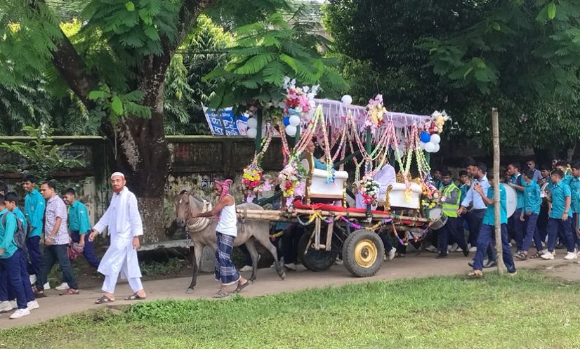 সুসজ্জিত ঘোড়ার গাড়িতে চড়িয়ে শিক্ষককে বিদায় দিচ্ছেন শিক্ষার্থীরা